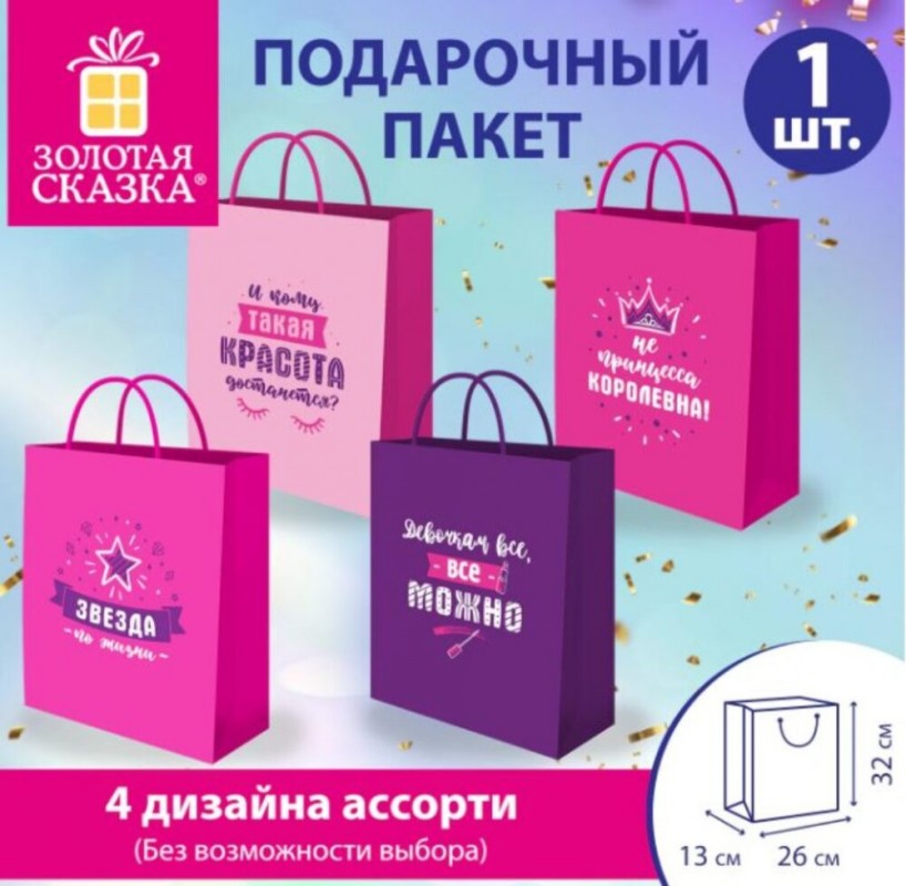 Артикул: Пакет подарочный 26х13х32 см (L), "For Girl", ассорти, крафт, ЗОЛОТАЯСКАЗКА, 700815