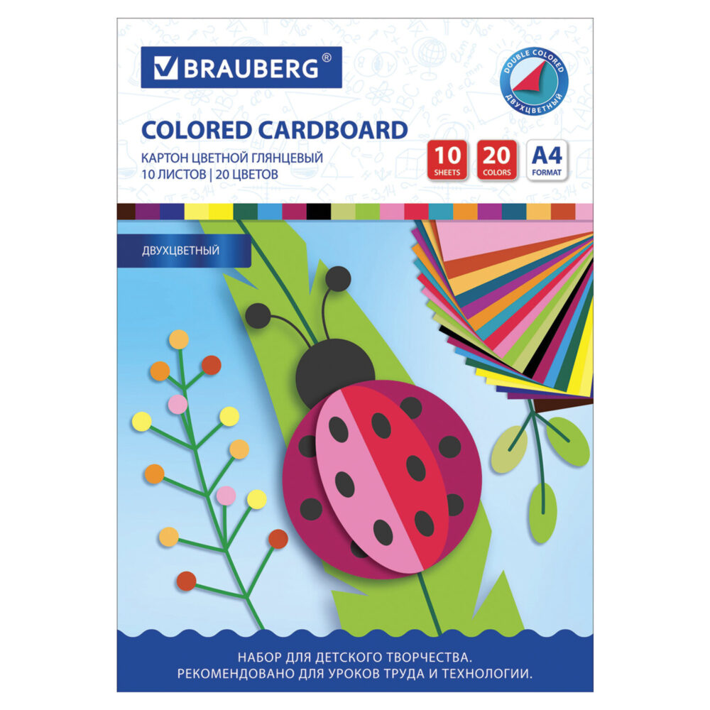 Картон цветной 10цв 20л. А4 2-цветный МЕЛОВАННЫЙ, BRAUBERG, 200х290 мм, (арт. С113553)
