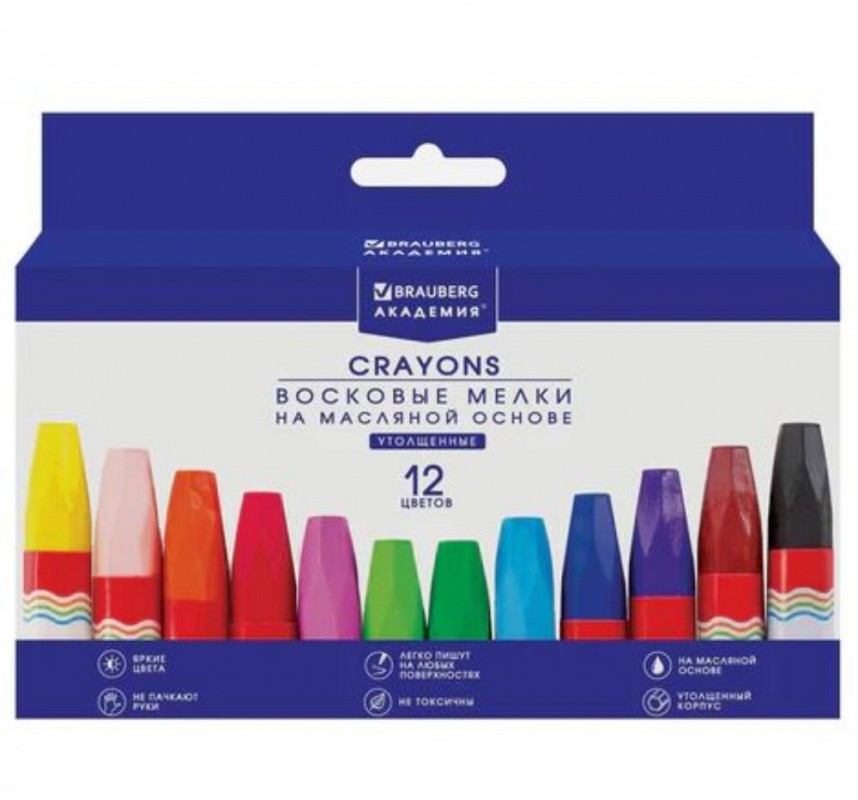 Артикул: Карандаши Восковые мелки утолщенные BRAUBERG "АКАДЕМИЯ", НАБОР 12 цветов, на масляной основе,