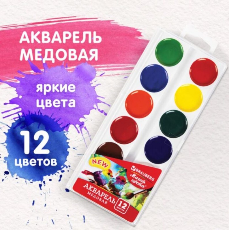 Артикул: Краски 12цв. акварельные BRAUBERG "МАГИЯ ЦВЕТА NEW", медовые, круглые кюветы, 192286
