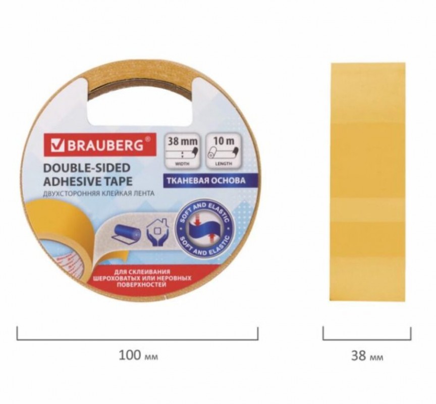 Артикул: Скотч Клейкая двухсторонняя лента 38мм х10м, ТКАНЕВАЯ ОСНОВА, BRAUBERG, 606428
