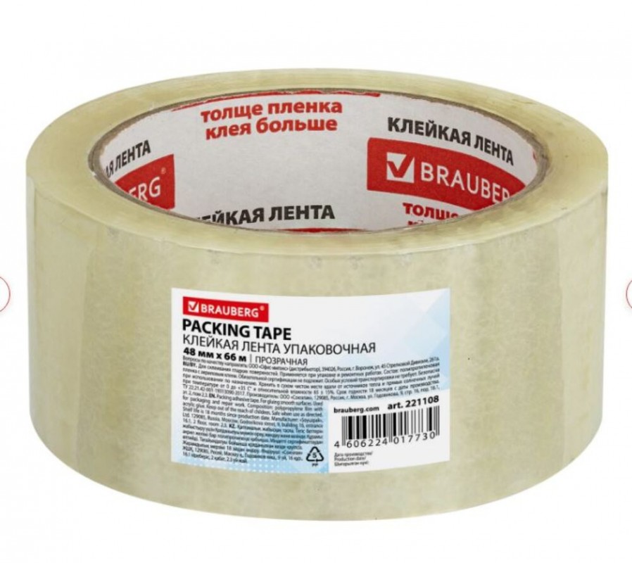 Артикул: 3 ск. Скотч Клейкая лента упаковочная 48 мм х 66м, прозрачная, толщина 45 микрон, BRAUBERG, 221108